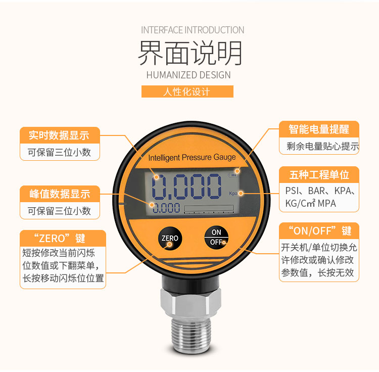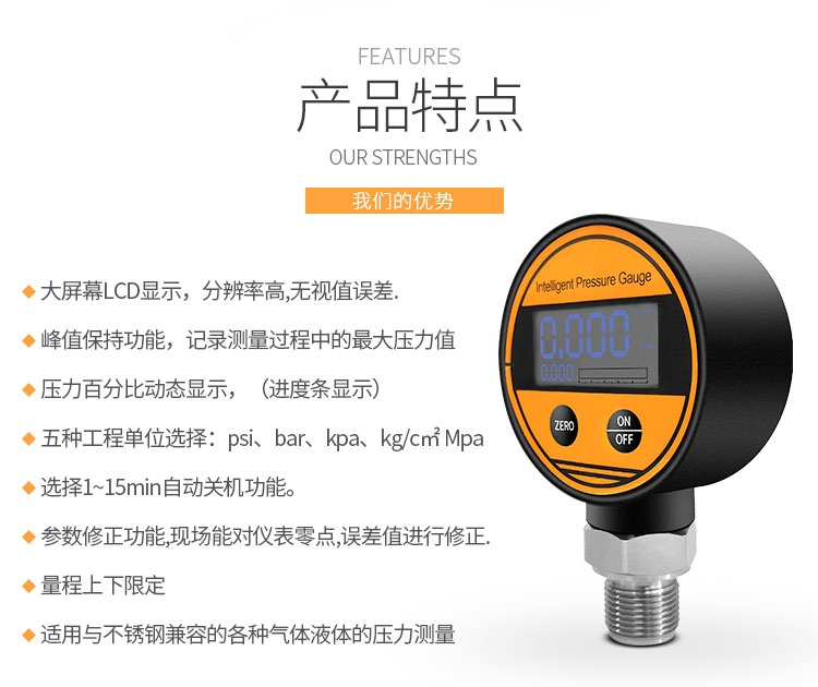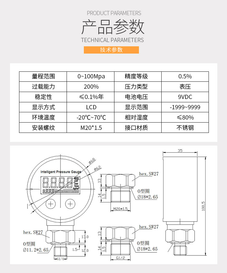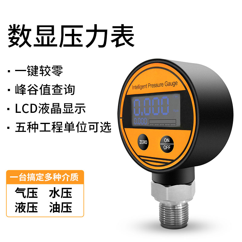 數(shù)字壓力表為全電子結構,采用電池供電,現(xiàn)場安裝簡易。前端采用高精度壓阻式壓力傳感器,輸出信號由高精度,低溫漂的放大器放大處理,送入高精度的A/D轉換器,轉換成微處理器可以處理的數(shù)字信號,經過運算處理,由LCD顯示器顯示出實際的壓力值。 該智能數(shù)顯壓力表使用靈活,操作簡單,調試容易,安全可靠。