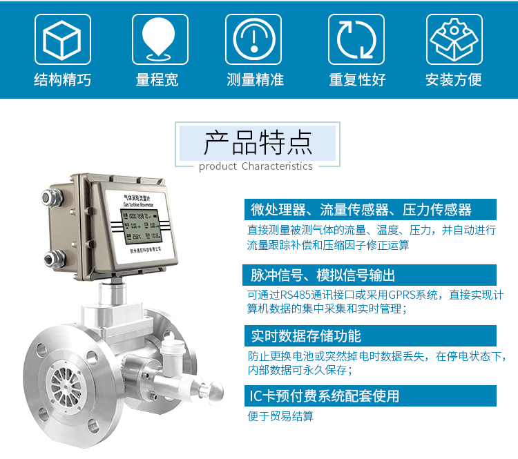 溫壓補償型氣體渦輪流量計集氣體渦輪流量傳感器與流量轉(zhuǎn)換器于一體,在流體的作用下,渦輪克服阻力矩和磨擦力矩開始轉(zhuǎn)動。當(dāng)力矩達(dá)到平衡時,轉(zhuǎn)速穩(wěn)定,渦輪的轉(zhuǎn)速與氣體流量成正比, 并通過旋轉(zhuǎn)的發(fā)訊盤上的磁體周期性地改變磁場,從而使脈沖發(fā)生器輸出頻率與流速成正比的脈沖信號。